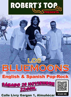 ALMUÑÉCAR – In bar/restaurant Robert’s Top in Almuñécar staat zaterdagavond 29 november een optreden geprogrammeerd van de formatie Los BlueMoons. Het optreden begint rond 22.00 uur en duurt tot circa middernacht.