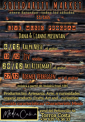 TORROX – Bij Chiringuito Medía Caña in de kustplaats Torrox is zaterdag 6 december een zogeheten ´Solidarity Market´ te bezoeken. Media Caña is te vinden aan de Avenida del Peñoncillo (de kustweg) 46 in Torrox, op circa tien kilometer van Nerja.