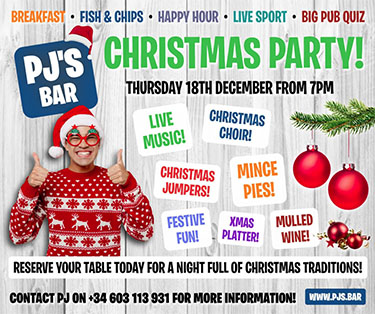 NERJA – Bij PJ´s Bar in Nerja, achter de atletiekvelden en het overdekte zwembad langs de N-340, staat donderdagavond 18 december een Christmas Party geprogrammeerd. De avond begint om 19.00 uur en staat bol van de (Engelse) kerstgebruiken- en activiteiten.