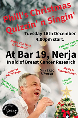 NERJA – Bij Bar 19 in het centrum van Nerja aan de Calle Málaga, treedt dinsdagmiddag 16 december de zanger Phil Sings Swing op. De bar is te vinden onder de Edificio Almeria 16.