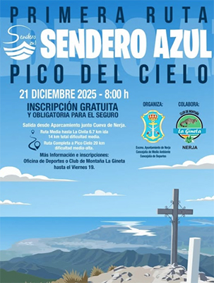 NERJA – Op initiatief van de gemeente Nerja en de lokale Club de Montaña La Gineta staat er zondag 21 december een wandeltocht naar de Pico del Cielo op het programma. Deelname aan deze begeleide tocht is gratis, het vertrek staat gepland om 08.00 uur ´s morgens. Vooraf inschrijven is noodzakelijk.