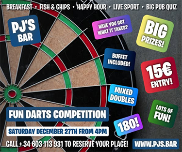 NERJA – Bij PJ´s Bar in Nerja wordt op zaterdag 27 december een dartstoernooi gehouden. Deze bar is te vinden achter de lokale atletiekbaan, in de wijk El Zoco.