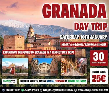 NERJA – Vanuit Nerja is voor donderdag 8 januari door de Axarquia Social Club een dagtrip per bus uitgezet naar Granada. De deelnamekosten bedragen 25 euro per persoon, vertrokken wordt er vanuit Nerja, Torrox en Vélez-Málaga.