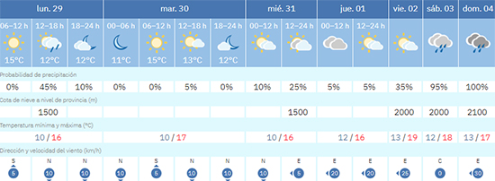 Op vrijdag 2 januari kan het kwik volgens Aemet oplopen naar 19 graden Celsius, in het weekeinde schommelt de temperatuur rond de 17 en 18 graden. Wel wordt er voor zowel zaterdag 3 als zondag 4 januari neerslag voorzien en neemt de wind in kracht toe.