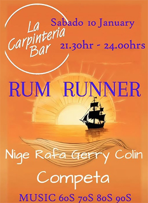 CÓMPETA – De formatie Rum Runner treedt zaterdagavond 10 januari op bij La Carpinteria Bar in het Axarquía-dorp Cómpeta. Het optreden begint rond 21.30 uur.