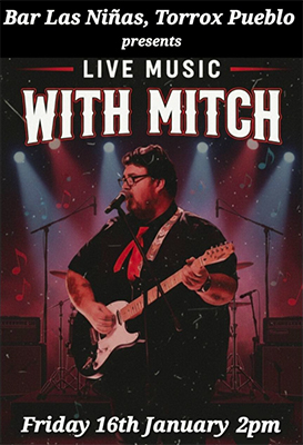 TORROX – De zanger en gitarist Mitch treedt vrijdagmiddag 16 januari op bij Bar Las Niñas in Torrox-Pueblo. Het optreden begint rond de klok van 14.00 uur.