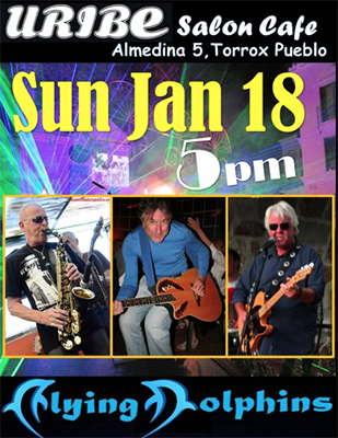 TORROX – Bij Uribe Salon Cafe in de kustplaats Torrox (een kleine tien kilometer onder Nerja gelegen) treedt zondagavond 18 januari de uit Nerja afkomstige en regionaal mateloos populaire band Flying Dolphins op.