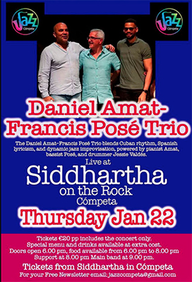 Het optreden begint rond 21.00 uur. Toegangskaarten kosten 20 euro per persoon en zijn in de voorverkoop verkrijgbaar bij de bar. Het Trio bestaat uit de pianist Daniel Amat, de bassist Francis Posé en de drummer Jessie Valdéz.