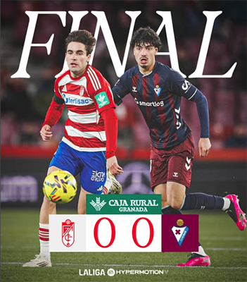 GRANADA – In het voetbalstadion Nuevo Los Cármenes van Granada is de voetbalclub van die naam er maandagavond 19 januari niet in geslaagd zich te ontdoen van de Baskische tegenstander SD Eibar. Na negentig minuten voetbal was de 0-0 beginstand nog steeds ongewijzigd.