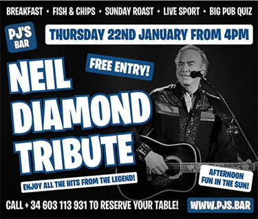 NERJA – Bij PJ´s Bar in Nerja is donderdagmiddag 22 januari een Neil Diamond Tribute te beluisteren. De uitvoerende artiest daarbij is Nigel Smith.