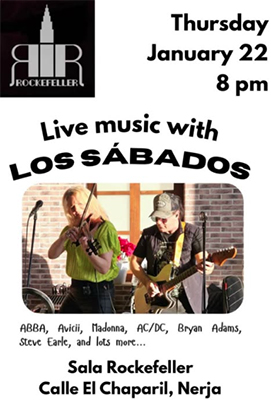 Dúo Los Sábados treedt op bij Sala Rockefeller NERJA – Het Dúo Los Sábados treedt donderdagavond 22 januari op bij Sala Rockefeller by Fitzgerald´s in Nerja, in het centrum van de stad aan de Calle El Chaparil 7. Het optreden begint rond 20.00 uur. Delen: Delen op X (Opent in een nieuw venster) X Share op Facebook (Opent in een nieuw venster) Facebook Vind-ik-leuk Aan het laden...