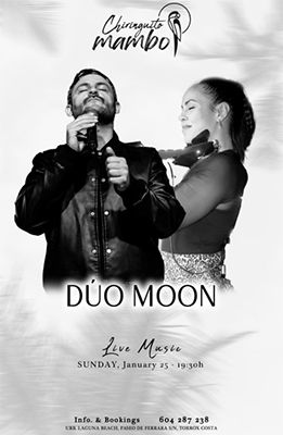 TORROX – Bij Chiringuito Mambo in Torrox treedt zondagavond 25 januari het Dúo Moon op. Het optreden begint om circa 19.30 uur.