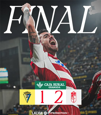 Granada kreeg daarbij onbedoeld hulp van de thuisclub. Eerst werkte Cádiz-speler Mario Climent de bal in de elfde minuut in het eigen doel (0-1). Alvaro García Pascual zette de thuisclub in de 61ste minuut naast Granada (1-1) maar drie minuten daarna kwamen de bezoekers (tegen de veldverhouding in, red.) opnieuw op voorsprong toen Rubén Alcaraz de bal uit een toegekende strafschop binnenschoot: 1-2. Brian Ocampo werd namens Cádiz in de blessuretijd nog met een rode kaart van de veld gestuurd.