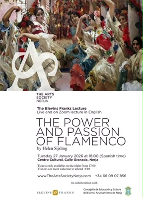NERJA – Bij de Arts Society Nerja kan dinsdagavond 27 januari een Engelstalige lezing worden bijgewoond. Deze wordt verzorgd door Helen Sijsling en heeft als titel ´The Power and Passion of Flamenco´.