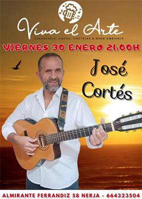 NERJA – Bij bar Viva el Arte in Nerja treedt vrijdagavond 30 januari de Spaanse artiest José Cortés op. Cerveceria Viva el Arte is te vinden aan de Calle Almirante Ferrandis (in de volksmond Calle Cristo genoemd) 58 in het centrum van Nerja.