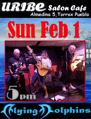 TORROX – Bij Uribe Salon Cafe in de kustplaats Torrox (een kleine tien kilometer onder Nerja gelegen) treedt zondagavond 1 februari de uit Nerja afkomstige en regionaal mateloos populaire band Flying Dolphins op.