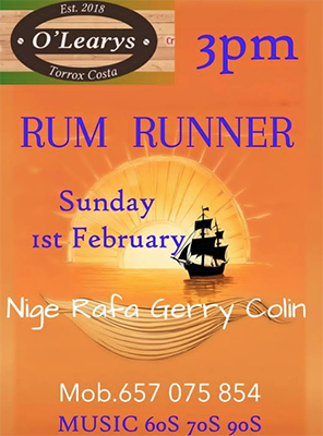 Dúo Rum Runner treedt op bij O´Leary´s TORROX – Het Dúo Rum Runner treedt zondagmiddag 1 februari op bij de Ierse pub O’Leary’s in Torrox. Het optreden begint rond de klok van 15.00 uur. De Ierse pub is te vinden aan de Paseo Maritímo de Ferrara in de kustplaats Torrox. Delen: Delen op X (Opent in een nieuw venster) X Share op Facebook (Opent in een nieuw venster) Facebook Vind-ik-leuk Aan het laden...