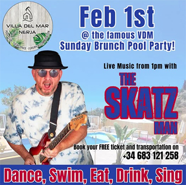 MARO – De zanger The SkatzMan treedt zondagmiddag 1 februari op bij camping Villa del Mar in Maro (aan de kust naast Nerja gelegen). Het optreden is vrij toegankelijk, de show begint rond de klok van 13.00 uur en duurt tot circa 16.00 uur.
