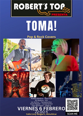 ALMUÑÉCAR – Bij bar/restaurant Robert’s Top, in de kustplaats Almuñécar, debuteert vrijdagavond 6 februari de formatie Toma! Het optreden begint rond 22.00 uur en duurt ongeveer twee uur.