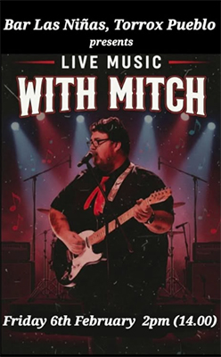 TORROX – De zanger en gitarist Mitch treedt vrijdagmiddag 6 februari op bij Bar Las Niñas in Torrox. Het optreden begint rond de klok van 14.00 uur.