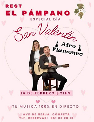 CÓMPETA – Het duo Aire Flamenco treedt zaterdagavond 14 februari (Valentijnsdag) op bij restaurant El Pámpano in het dorp Cómpeta. Het optreden begint rond 21.00 uur.