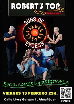 ALMUÑÉCAR – Bij bar/restaurant Robert’s Top in Almuñécar staat vrijdagavond 13 februari een optreden geprogrammeerd van de band Suns of Excess. Het optreden begint rond 22.00 uur.