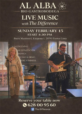 Dit gebeurt bij bio-en gastrobodega Al Alba aan de Calle Estepona 1 in Torrox. Het optreden begint rond 16.30 uur. Het reserveren van een tafel kan via het telefoonnummer (+34) 628 009 560. The Difference brengt onder meer pop-, country-, soul- en rock´n´roll-muziek ten gehore.