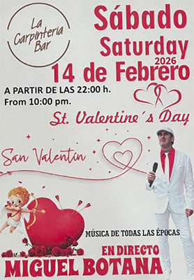 CÓMPETA – De Spaanse zanger Miguel Botana treedt zaterdag 14 februari (Valentijnsdag) op bij La Carpinteria Bar in het Axarquía-dorp Cómpeta. Het optreden begint rond 14.00 uur en wordt in de avonduren om 22.00 uur herhaald.