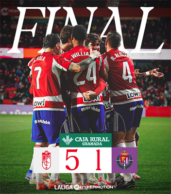 GRANADA – Voetbalclub Granada CF heeft zichzelf zaterdagavond 14 februari een goede dienst bewezen in de strijd tegen degradatie door een andere laagvlieger in de Spaanse Segunda División, Real Valladolid, met ruim verschil te verslaan. In het stadion Nuevo Los Cármenes van Granada was de thuisclub heer en meester: 5-1.