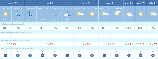 Daarin wordt gewag gemaakt van droog weer met temperaturen van gemiddeld 19 graden Celsius. Daarnaast, en dat is voor het eerst sinds ruim een maand, is er nauwelijks sprake van wind rond Nerja. Tot en met woensdag 25 februari laat deze het vrijwel geheel afweten, op donderdag 26 en vrijdag 27 februari is er sprake van een zwakke bries. De zon laat zich de komende dagen regelmatig zien aan de hemel boven Nerja.
