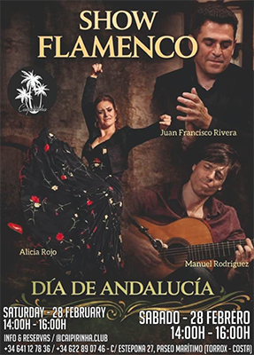 TORROX-COSTA – Bij de Caiprinha Club in Torrox, een kleine tien kilometer onder Nerja richting Málaga aan de kust gelegen, kan op zaterdagmiddag 28 februari (Día de Andalucía, red.) een flamencoshow worden bijgewoond.
