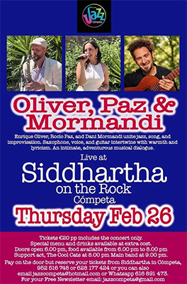 CÓMPETA – In het bergdorp Cómpeta treedt donderdagavond 26 februari het trio jazzmuzikanten Enrique Oliver, Rocío Paz en Dani Mormandi op bij bar Siddhartha aan de Calle Aguacate 2.