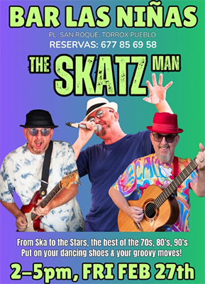 TORROX – De zanger en gitarist The Skatz Man treedt vrijdagmiddag 27 februari op bij Bar Las Niñas in Torrox. Het optreden begint rond de klok van 14.00 uur en duurt tot circa 17.00 uur.