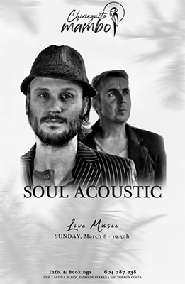 TORROX – Bij Chiringuito Mambo in Torrox treedt zondagavond 8 maart de formatie Acoustic Soul op. Het optreden begint om circa 19.30 uur en duurt ongeveer twee uur.