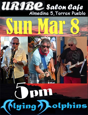 TORROX – Bij Uribe Salon Cafe in de kustplaats Torrox (een kleine tien kilometer onder Nerja gelegen) treedt zondagmiddag 8 maart de uit Nerja afkomstige en regionaal mateloos populaire band Flying Dolphins op.