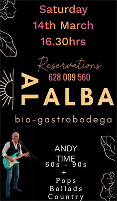 Dit gebeurt bij bio-en gastrobodega Al Alba aan de Calle Estepona 1 in Torrox. Het optreden begint rond 16.30 uur. De artiest brengt daarbij zowel pop- en countrymuziek als ballads ten gehore. Het reserveren van een plaats kan via het telefoonnummer (+34) 628 009 560.