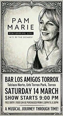 TORROX – De zangeres Pam Marie treedt zaterdagavond 14 maart op bij bar Los Amigos in de kustplaats Torrox. De bar is gevestigd in de urbanisatie Torrox Park aan het Centro Commercial 1b.