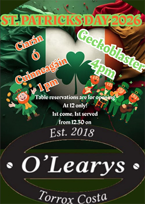 TORROX – De Ierse pub O’Leary’s in Torrox viert dinsdag 17 maart de Ierse nationale feestdag St. Patricks Day met een optreden van de Ierse zanger en gitarist Cíarán Ó´Cuínneagáin. Het optreden begint rond de klok van 13.00 uur.
