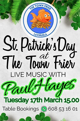 LA VIÑUELA – Op de Ierse nationale feestdag, St. Patricks Day, treedt de zanger en gitarist Paul Hayes dinsdag 17 maart op bij bar The Town Frier in het Axarquía-dorp La Viñuela.