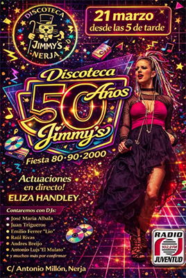 NERJA – De zangeres Eliza Handley treedt zaterdagavond 21 maart op bij discotheek Jimmy´s aan de Calle Antonio Millón 6 in het centrum van Nerja. De discotheek viert dan het 50(!)-jarig bestaan.