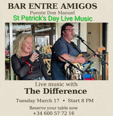 Het optreden op de Ierse nationale feestdag St. Patricks Day begint rond de klok van 20.00 uur bij Bar Entre Amigos. Het reserveren van een tafel kan via het telefoonnummer (+34) 600 577 216.