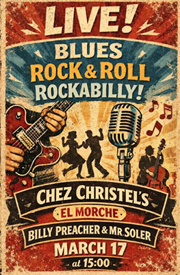 Het aanvangstijdstip is 15.00 uur. Preacher brengt vooral nummers van onder anderen Eric Clapton, Johnny Cash, Lou Reed en Elvis Presley ten gehore in een mix aan blues- en rockmuziek. Het optreden van ‘the one man band’ Billy Preacher bij Chez Christel is gratis toegankelijk.
