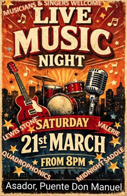 Het bergdorp ligt naast het Meer van Viñuela, het optreden begint rond de klok van 20.00 uur en vindt plaats bij restaurant-bar El Asador.