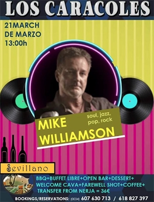 TORROX – Bij restaurante Los Caracoles del Sevillano aan de M-105 tussen Torrox en Frigiliana staat zaterdagmiddag 21 maart een optreden geprogrammeerd van de zanger en gitarist Mike Williamson. De middag begint rond de klok van 13.00 uur.