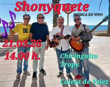 Formatie Shonyquete speelt bij Chiringuito Tropy CALETA DE VELEZ – In de kustplaats Caleta de Vélez treedt zaterdagmiddag 21 maart de formatie Shonyquete op. Dit gebeurt bij Chiringuito Tropy, vlakbij de jachthaven van Vélez-Málaga, Puerto Caleta de Vélez. Het optreden begint rond 14.00 uur. Delen: Delen op X (Opent in een nieuw venster) X Share op Facebook (Opent in een nieuw venster) Facebook Vind-ik-leuk Aan het laden...