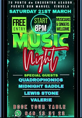 Het bergdorp ligt naast het Meer van Viñuela, de optredens beginnen rond de klok van 20.00 uur en vinden plaats bij restaurant-bar El Asador. Een plaats reserveren kan via het telefoonnummer (+34) 646 133 123. De optredende artiesten zijn de Quadraphonics, Midnight Saddle, Lewis Stone en Valerie.