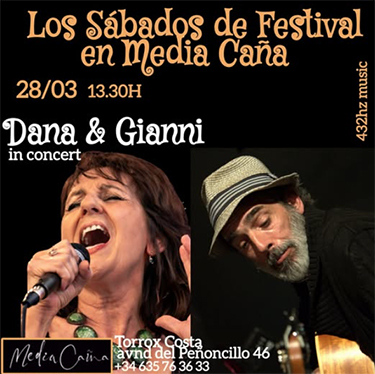 TORROX – Bij Chiringuito Medía Caña in de kustplaats Torrox treedt zaterdagmiddag 28 maart het regionaal vermaarde duo Dana Andrews & Gianni Piras op. Medía Caña is te vinden aan de Avenida del Peñoncillo (de kustweg) 46 in Torrox, op circa tien kilometer van Nerja.