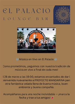 FRIGILIANA – In het bergdorp Frigiliana, op circa zeven kilometer landinwaarts van Nerja, treedt zaterdagavond 28 maart de uit Nerja afkomstige band Proyecto Mandarina op. Dit gebeurt bij loungebar El Palacio aan het Plaza de Las Tres Culturas 28 in Frigiliana.