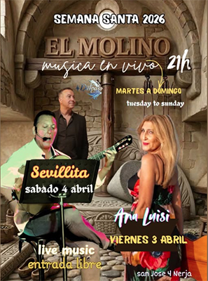 NERJA – Bij bar El Molino in de binnenstad van Nerja treedt komend weekeinde de regionaal vermaarde flamenco-artieste Ana Luisi op. De optredens staan gepland voor vrijdagavond 3 april en zaterdagavond 4 april rond 21.00 uur en duren tot circa 01.00 uur in de nacht.