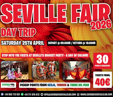 Het vertrek staat gepland rond 09.00 uur, de terugkeer vanuit Sevilla staat gepland om 18.00 uur. Opgeven voor de trip is telefonisch mogelijk via het nummer (+34) 603 113 931 of via internet: http://www.axarquiasocialclub.com . Om de trip doorgang te laten vinden is een minimale bezetting van dertig personen nodig.